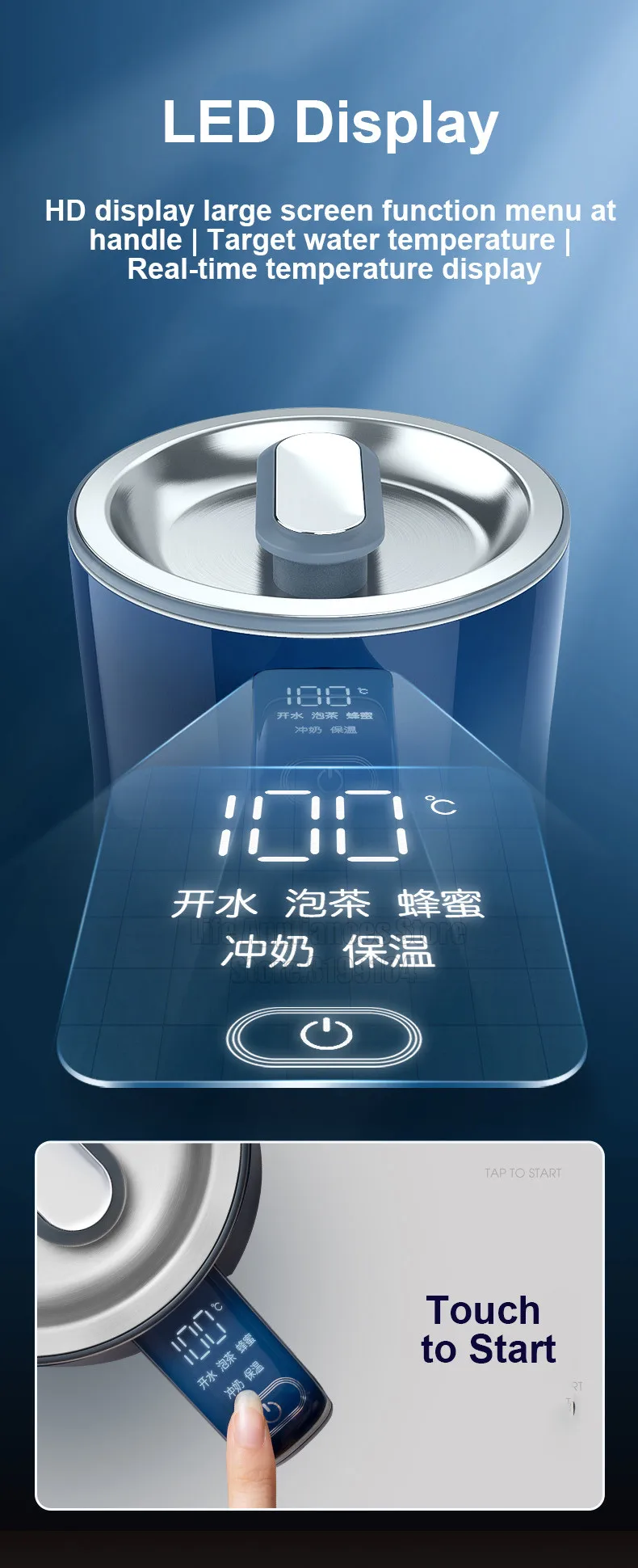 ●4 levels of temperature adjustment, 45℃, 55℃, 85℃, 100℃, intelligent heat preservation, convenient for you to brew different drinks, such as tea, coffee, milk powder, etc.;