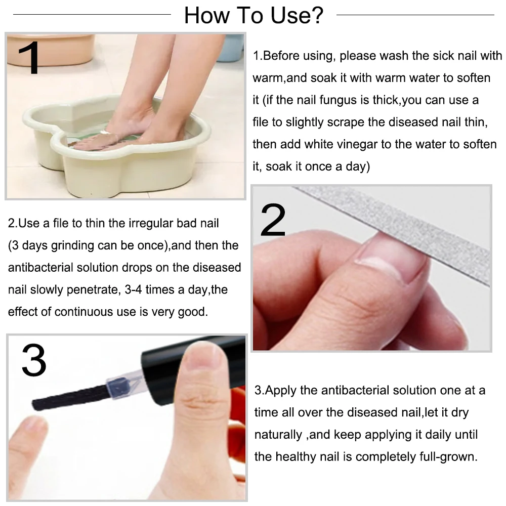 How to use?1.Before using, please wash the sick nail with warm water, and soak it with warm water to soften it(if the nail fungus is thick, you can use a file to scrape the sick nail slightly,then add white vinegar to the water to soften it,soak it once a day.)2.Use a file to thin the irregular bad nail(3 days to grind once) 3 days grinding can be once),and then the antibacterial solution drops on the diseased nail slowly penetrate,3-4 times a day,the effect of continuous use is very good.3.Apply the antibacterial soluton one at a time all over the diseased nail,let it dry naturally,and keep applying it daily until the healthy nail is completely full-grown.